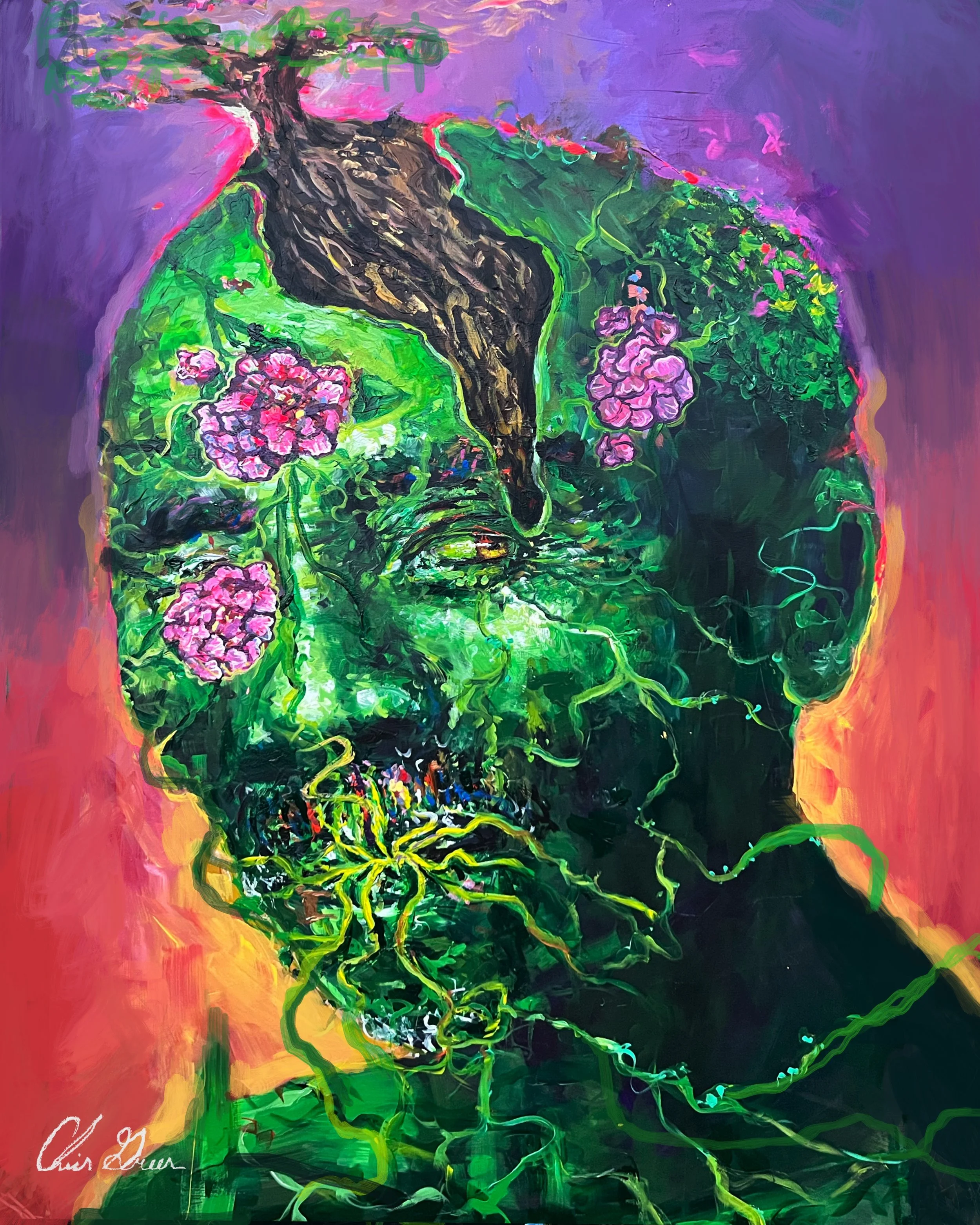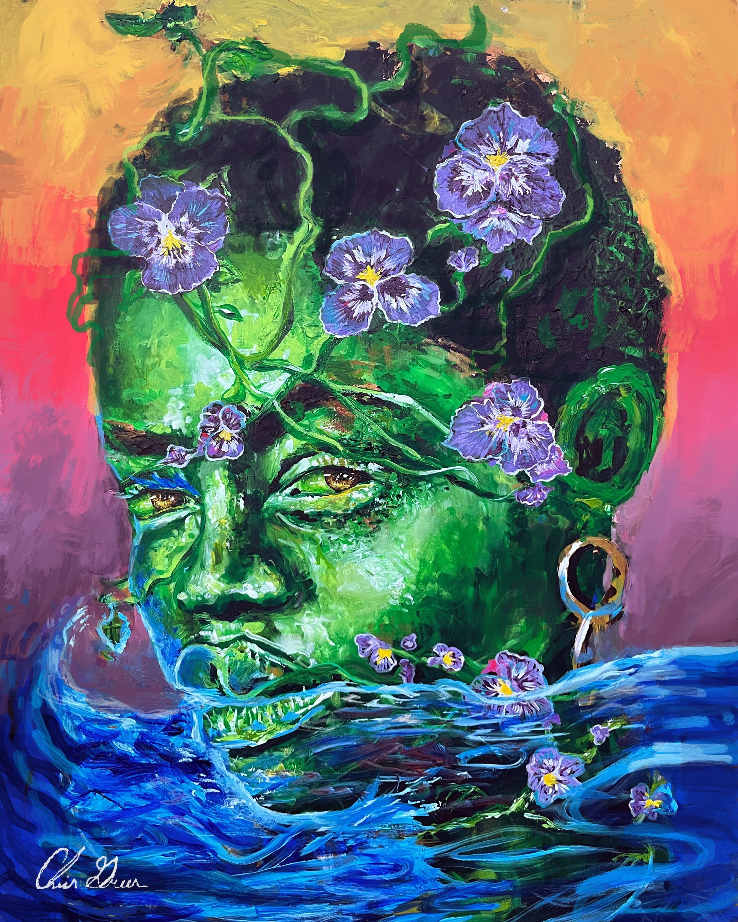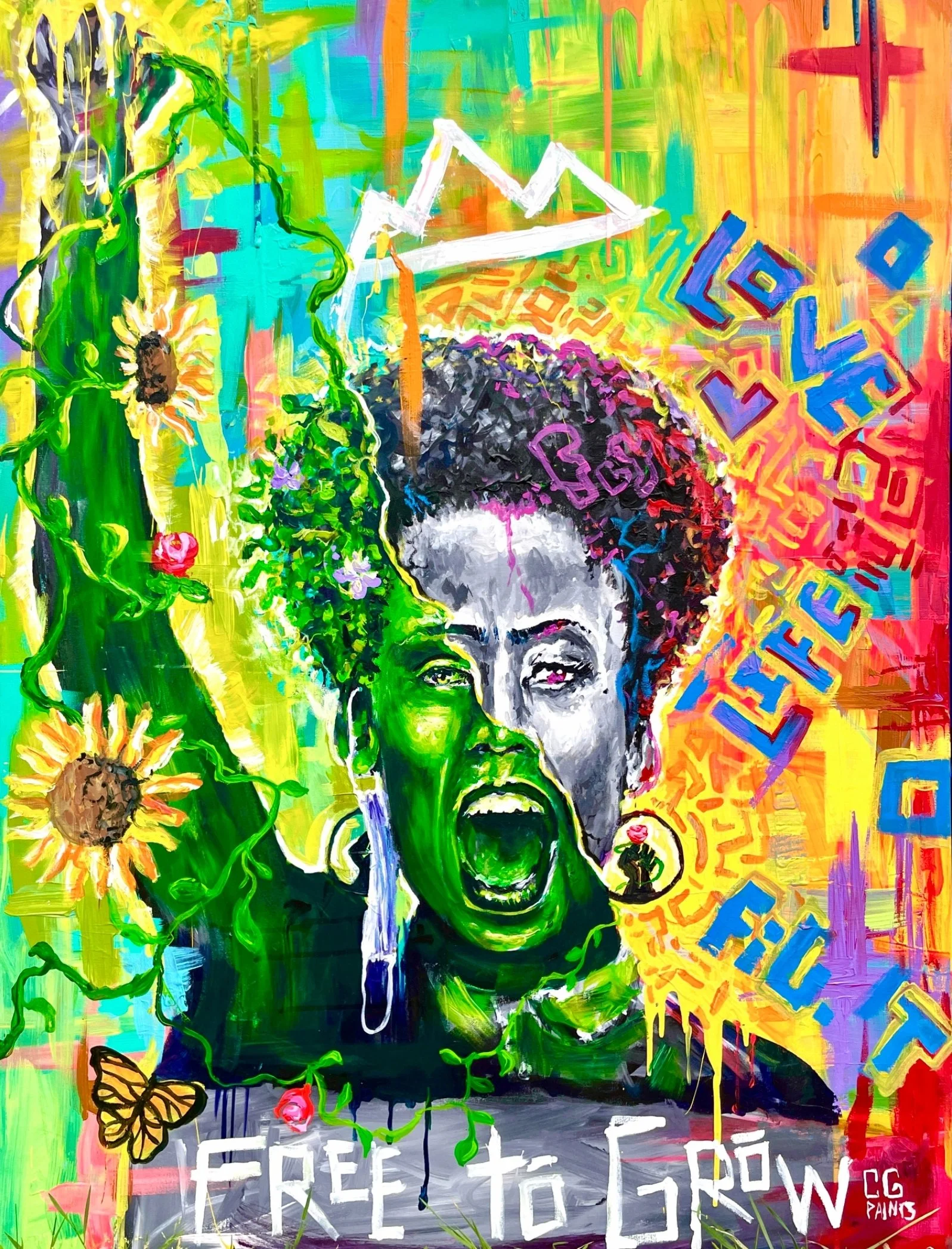 Voices in Bloom" is a thought-provoking painting capturing the complexity of activism. Capturing activism's duality: vibrant greenery symbolizes growth, while black, white, and yellow hues portray struggle and reality.